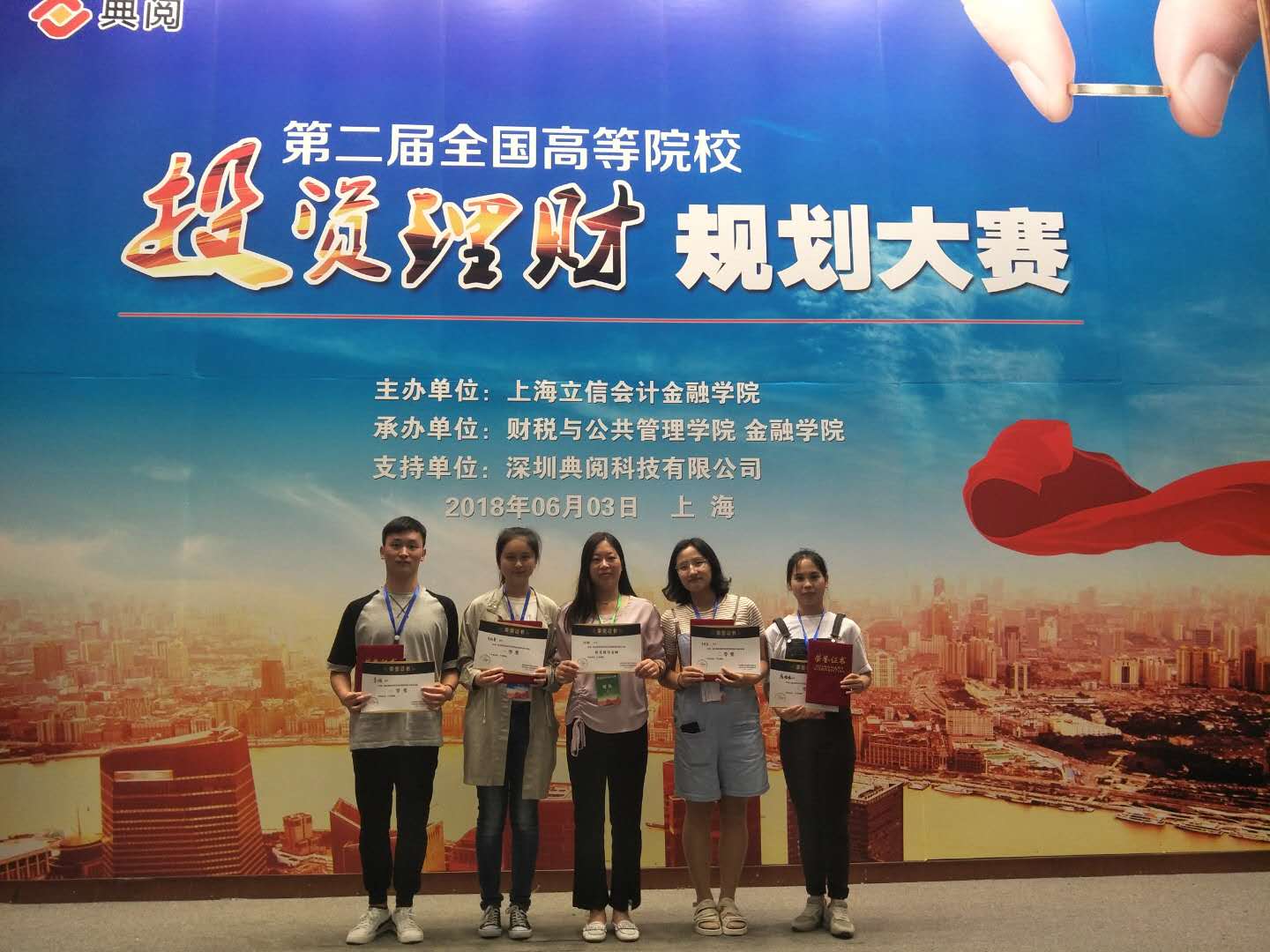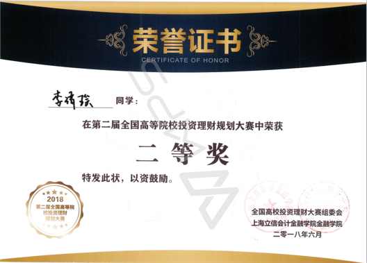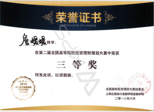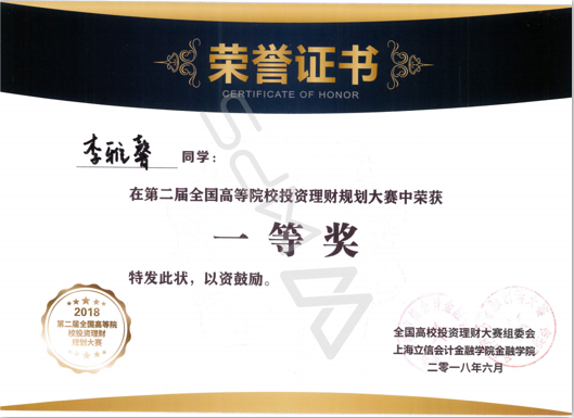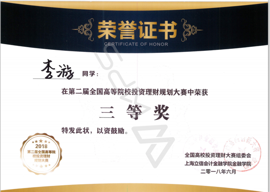 6月3日,第二届全国高等院校投资理财规划大赛在上海立信会计金融学院举行,比赛共有来自西南政法大学、广东财经大学、上海立信会计金融学院等全国20多个省市的33所高校130余名学生参加。我校必赢bwin线路检测中心金融系刘欣老师带领4名学生代表学校参加了比赛。经过激烈争夺,最终我校参赛团队获得团体二等奖,李雅馨获得一等奖,李清瑶获得二等奖,李游、詹媛媛获得三等奖。